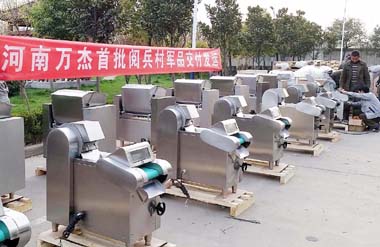 近日,河南萬杰食品機械有限公司排列整齊的食品機械準(zhǔn)備裝車,發(fā)往“中國人民抗日戰(zhàn)爭暨世界反法西斯戰(zhàn)爭勝利70周年閱兵”部隊駐地。