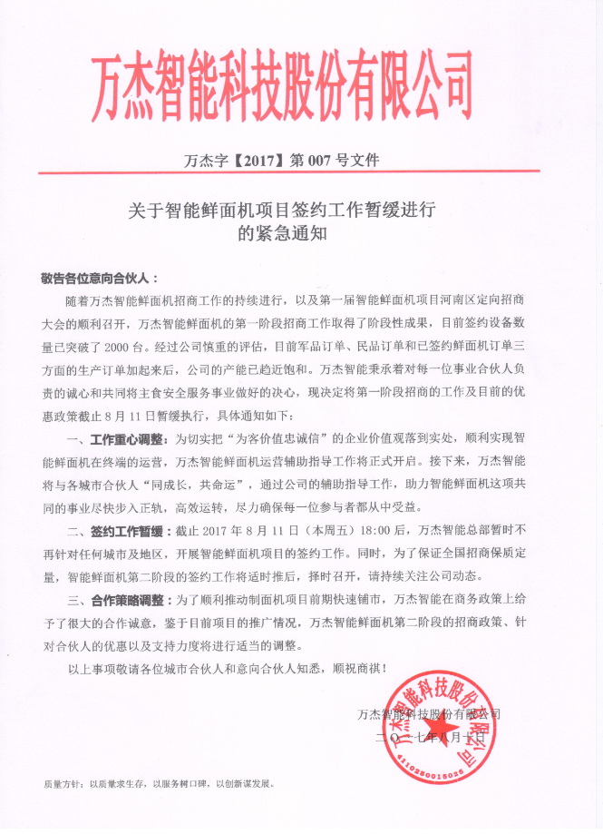 敬告各位意向合伙人: 隨著萬杰智能鮮面機(jī)招商工作的持續(xù)進(jìn)行,以及第一屆智能鮮面機(jī)項(xiàng)目河南區(qū)定向招商大會的順利召開,萬杰智能鮮面機(jī)的第一階段招商工作取得了階段性成果,目前簽約設(shè)備數(shù)量已突破了2000臺。經(jīng)過公司慎重的評估,目前軍品訂單、民品訂單和已簽約鮮面機(jī)訂單三方面的生產(chǎn)訂單加起來后,公司的產(chǎn)能已趨近飽和。萬杰智能秉承著對每一位事業(yè)合伙人負(fù)責(zé)的誠心和共同將主食安全服務(wù)事業(yè)做好的決心,現(xiàn)決定將第一階段招商的工作及目前的優(yōu)惠政策截止8月11日暫緩執(zhí)行,具體通知如下: 一、工作重心調(diào)整:為切實(shí)把“為客價值忠誠信”的企業(yè)價值觀落到實(shí)處,順利實(shí)現(xiàn)智能鮮面機(jī)在終端的運(yùn)營,萬杰智能鮮面機(jī)運(yùn)營輔助指導(dǎo)工作將正式開啟。接下來,萬杰智能將與各城市合伙人“同成長,共命運(yùn)”,通過公司的輔助指導(dǎo)工作,助力智能鮮面機(jī)這項(xiàng)共同的事業(yè)盡快步入正軌,高效運(yùn)轉(zhuǎn),盡力確保每一位參與者都從中受益。 二、簽約工作暫緩:截止2017年8月11日(本周五)18:00后,萬杰智能總部暫時不再針對任何城市及地區(qū),開展智能鮮面機(jī)項(xiàng)目的簽約工作。同時,為了保證全國招商保質(zhì)定量,智能鮮面機(jī)第二階段的簽約工作將適時推后,擇時召開,請持續(xù)關(guān)注公司動態(tài)。 三、合作策略調(diào)整:為了順利推動制面機(jī)項(xiàng)目前期快速鋪市,萬杰智能在商務(wù)政策上給予了很大的合作誠意,鑒于目前項(xiàng)目的推廣情況,萬杰智能鮮面機(jī)第二階段的招商政策、針對合伙人的優(yōu)惠以及支持力度將進(jìn)行適當(dāng)?shù)恼{(diào)整。 以上事項(xiàng)敬請各位城市合伙人和意向合伙人知悉,順祝商祺!