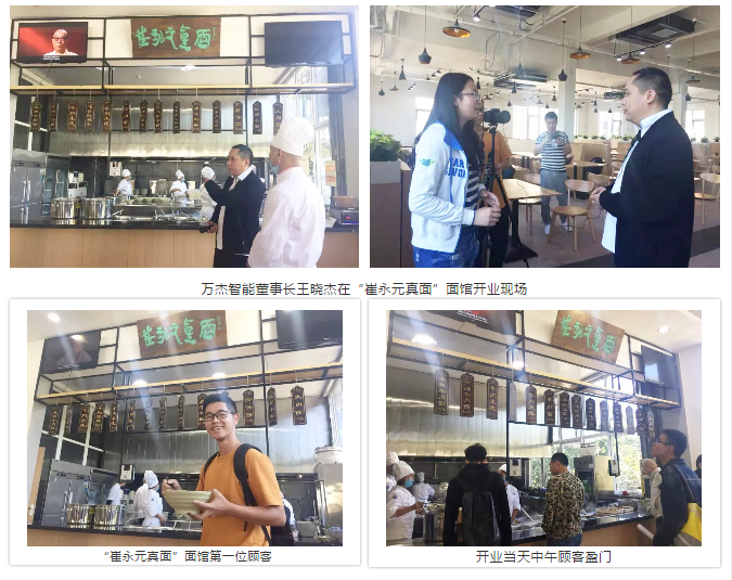 面館一開業,學生們、媒體和慕名而來的粉絲們都蜂擁而上,想嘗一嘗“真面”的味道。萬杰智能王曉杰董事長也不例外,作為粉絲和“技術工”,趕緊到現場湊個熱鬧,也“監督”一下他的兩位“面案師傅”工作。而這二位也真爭氣,獲得了顧客紛紛點贊。