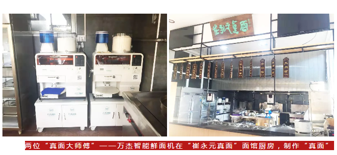 兩臺萬杰智能鮮面機成為面館的兩位“面案師傅”,在后廚大顯身手。從面粉到面條,只需8秒,現吃現做,全程封閉,無添加無污染,全面呈現面條應有的味道和口感。