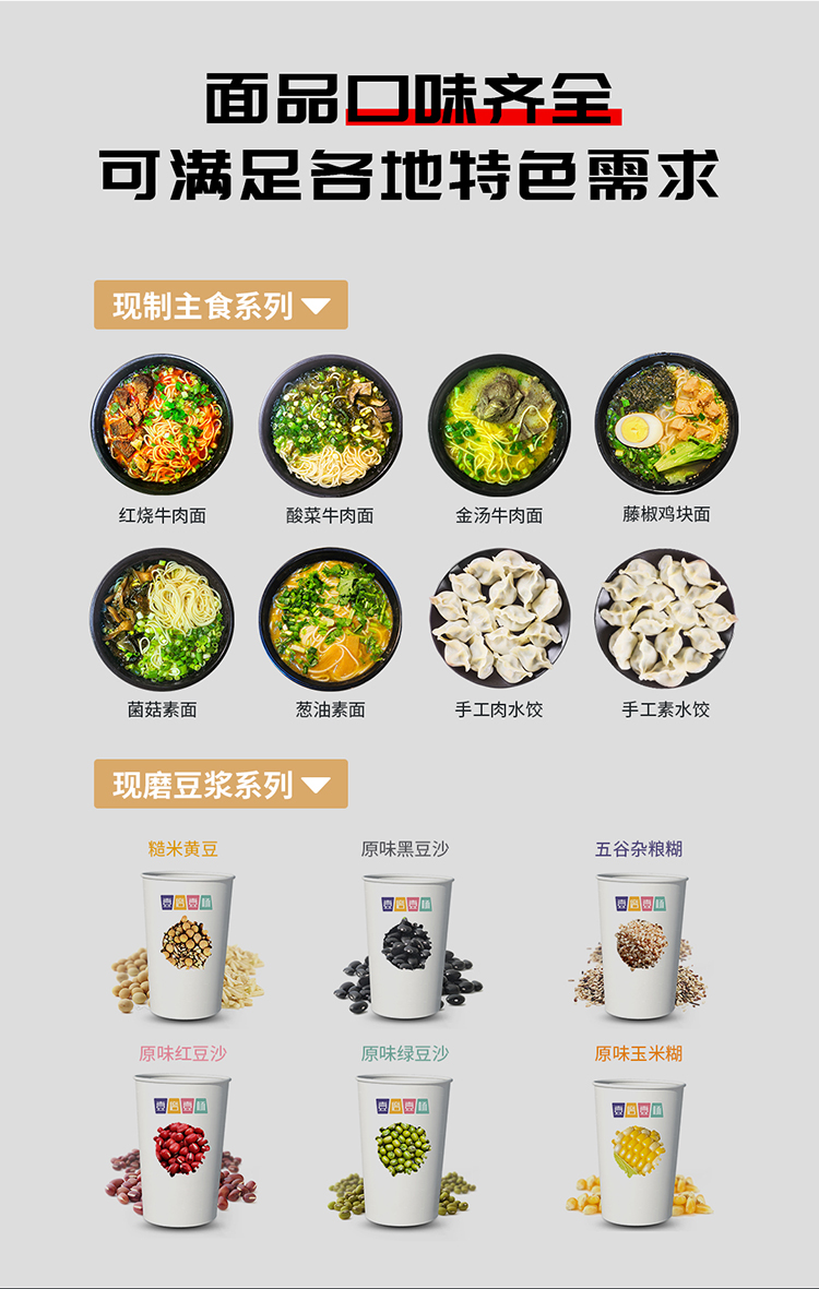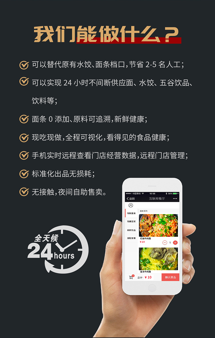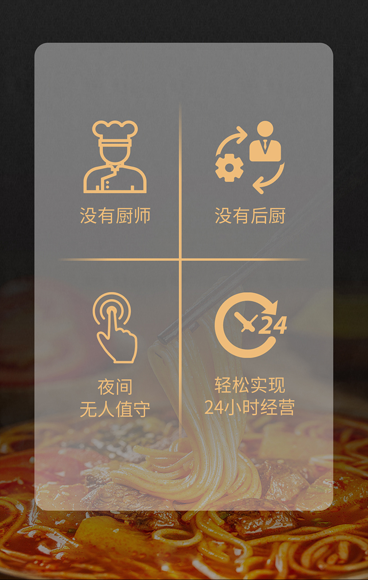 - 可以實(shí)現(xiàn)24小時(shí)不間斷供應(yīng)面、水餃、五谷飲品、飲料等;
